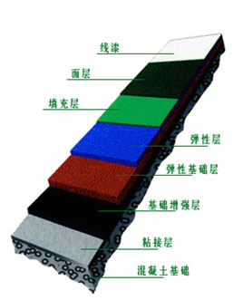塑材软垫及丙烯酸涂面系统,其厚度约为3-4mm。内含高标准无机性纤维颜料,铺设在已冲洗干折余价值良好及排水斜度(1:100至1:150之内)的水泥或沥青地面基础上。
