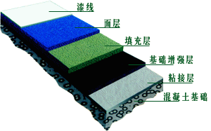 丙烯酸涂面系统,厚度约为1-2mm。内含高标准无机性纤维颜料,铺设在已冲洗干折余价值良好及排水斜度(1:100至1:150之内)的水泥或沥青地面基础上。