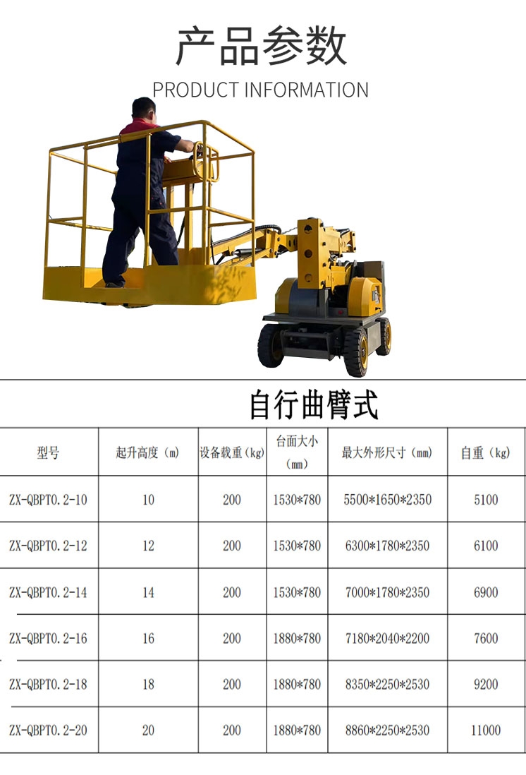 曲臂式升降机,是用于高空作业的升降设备,可跨越障碍进行高空作业,平台升降到任何位置时,均可边行走边作业,结构紧凑,转向灵活,其地盘的宽度可保证设备进入狭窄的通道及拥挤的工作区域。备用动力装置,可操作工作平台复位,方便的运输方式,可自行到任何地方。易于识别的操作面板,多重的机械,电气及液压安全保护,先进的一体化的液压电器集成系统,是目前为止垮障碍物作业性价比的高空作业设备。
