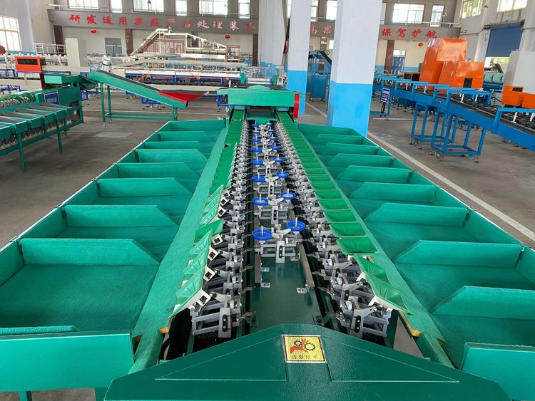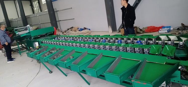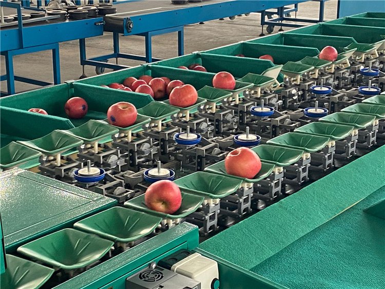 8、选果机先进的预排列技术。只需人工将水果倒在输送带上或上料斗,机械自动将水果进行排队,一个一个落入果盘进行称重分选。
