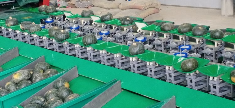 分选机出口果斗多种选择:可以做成通道式直接流下来,适合分选柠檬猕猴桃百香果贝贝南瓜,也可做成盛料斗形式,每个果斗可存放40斤水果,适合苹果桃子石榴等果蔬。