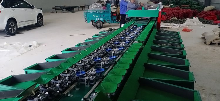 8、选果机先进的预排列技术。只需人工将水果倒在输送带上或上料斗,机械自动将水果进行排队,一个一个落入果盘进行称重分选。