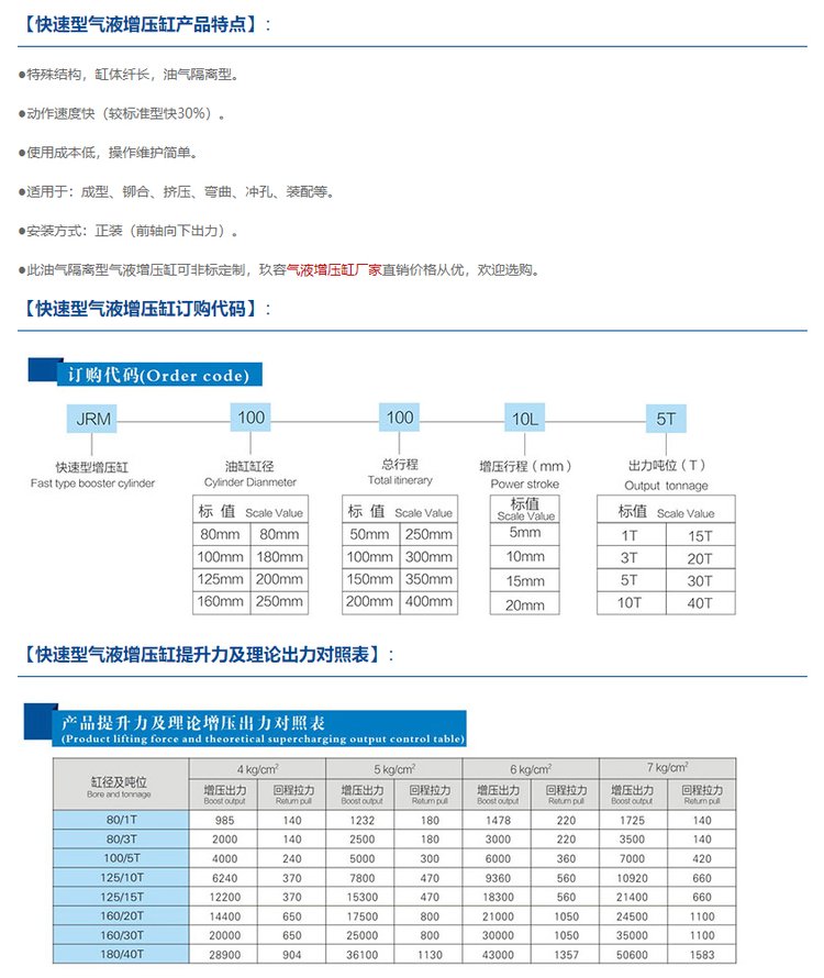JRM快速型气液增压缸2年免费保修非标定制专业团队