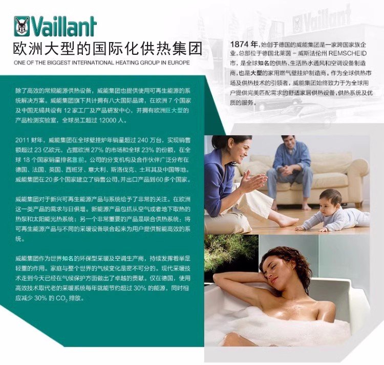 1995年德国威能壁挂炉进入中国成立了威能(北京)供暖设备有限公司,承担起在中国的推行、效劳、收购、出产和研制等事务,向广阔中国消费者供给系列燃气壁挂锅炉,落地式锅炉,燃气和电热水器,热泵,太阳能商品及运用可再生动力的关联设备。截止到2012年末,现已在全国各地累计共装置约35万台欧洲同步技能水平的家用燃气采暖热水壁挂锅炉,让中国用户开端充沛感触德国威能商品的描绘、环保、效劳及为日子发明的舒适性。