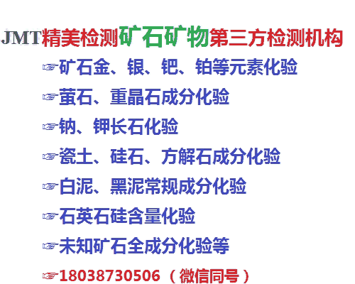 精美检测技术服务有限公司可以提供铍矿石鉴定,钽、铌矿鉴定,铂、钯、铑、金、银、鉴定,铼、铟、铍、锗、锆、铪、镓、钴、硒、硼、碲、锂稀有稀散金属鉴定,铁矿石鉴定,铜矿石鉴定,锰矿石鉴定,铅矿石分析,锌矿石鉴定,钼矿石鉴定,钴矿石鉴定,镍矿石鉴定,金矿石鉴定,银矿石鉴定,钒钛磁铁矿石鉴定,铝土矿矿石鉴定,稀土矿石鉴定,高岭土矿石鉴定,膨润土鉴定,凹凸土鉴定,多金属矿石鉴定等各种矿石鉴定,X射线荧光光谱定性半定量分析,ICP-AES全元素定性定量分析鉴定服务。