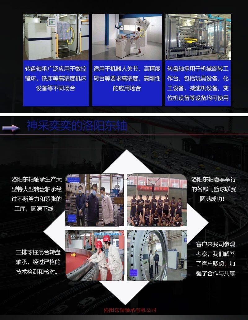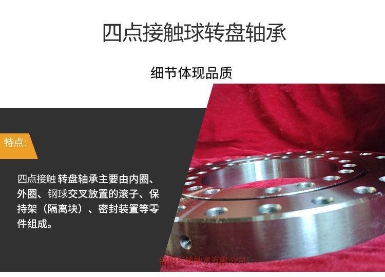我们生产的轴承是一种能够同时承受较大的轴向负荷、径向负荷和倾覆力矩等综合载荷的特殊结构的大型轴承。一般情况下,转盘轴承自身均带有安装孔、润滑油孔和密封装置,可以满足各种不同工况条件下工作的各类主机的不同需求;另一方面,转盘轴承本身具有结构紧凑、引导旋转方便、安装简便和维护容易等特点,被广泛用于起重运输机械、采掘机械、建筑工程机械、港口机械等大型回转装置上。我们生产的转盘轴承根据不同的结构型式可以分为四点接触球转盘轴承、双排角接触球转盘轴承、交叉圆柱滚子转盘轴承和三排圆柱滚子组合转盘轴承等不同的结构型式上述各类轴承按其是否带齿及轮齿的分布部位又分为无齿式、外齿式或内齿式等不同结构。