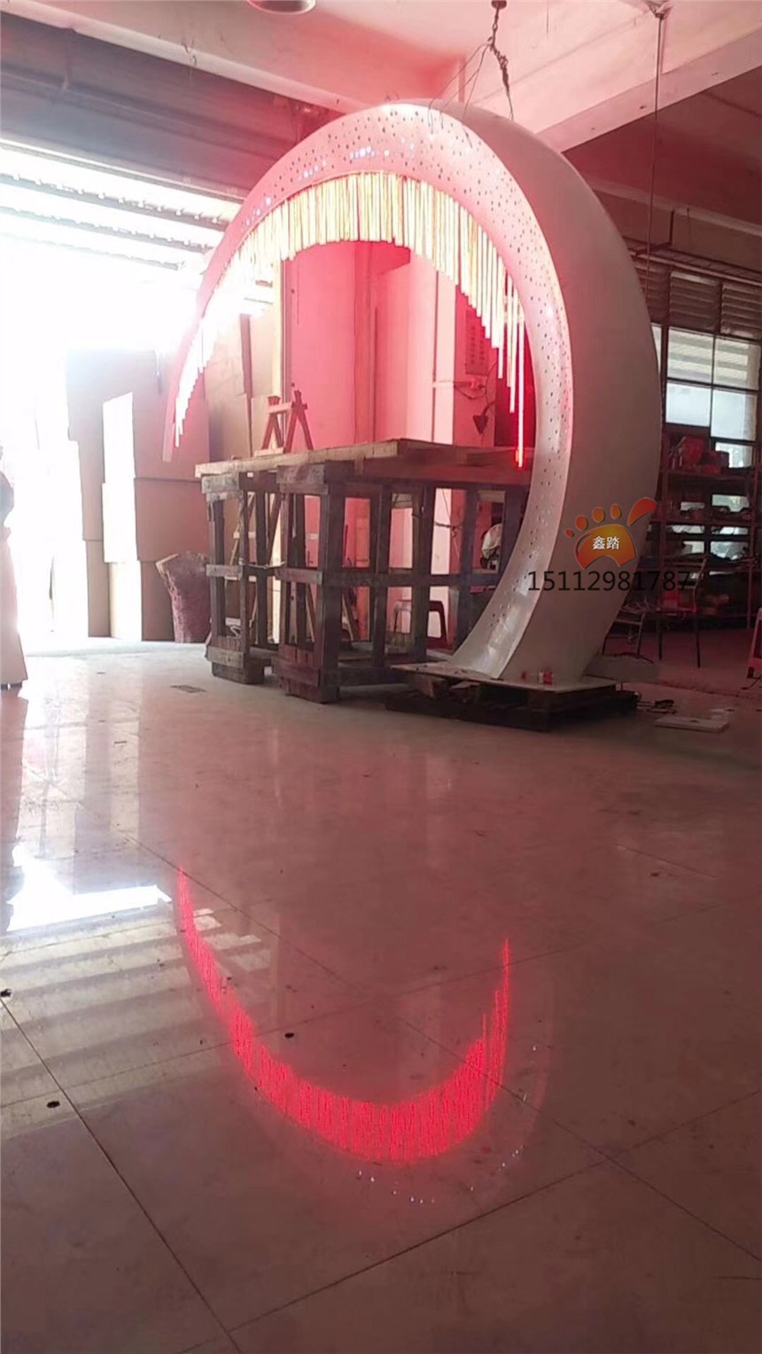 不锈钢月亮雕塑设计理念说明:水,与月共影;进见水,银河望月;“水利万物而不争”,进门即见中轴线大尺度水景,银河望月,藏风纳气。月亮雕塑犹如一弯明月水上来,水月共舞,为点睛之笔。月亮雕塑安装地点:清远恒大园林。