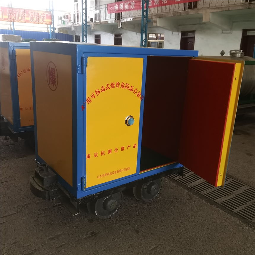 矿井轨道Z药车也可称为矿井轨道危险品运输车,是专门针对矿井运输各类危险 物品的车辆,比如Z药,L管,导爆管等,它是利用轨道将这些物品运输到井下需要施工的地点,根据矿井常用轨道,可定做600/762/900mm的轨距,具体的存放量可按需定制,如果存放量太大,建议分开多辆车,如果运输车超长,拐弯处轨道上行驶灵活性较差。存放柜材质使用的是6-8mm厚的防爆钢板,内层是10mm厚防静电木板,最里层是约2mm厚的防静电阻燃毡,柜体明显处喷涂“爆炸”字体,开门方式多为侧面开门,有特殊要求也可定制双侧开门或者上开。