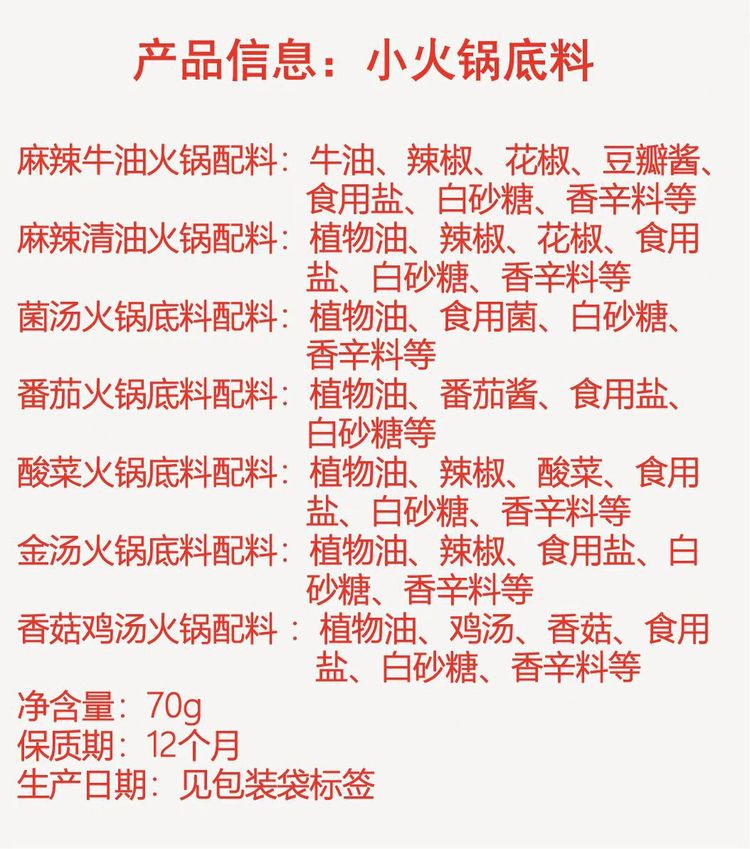 原料与配料 | 食用牛油,植物油,辣椒,辣椒酱,洋葱,花椒,盐渍泡辣椒,豆豉,生姜,香辛料,大蒜,白砂糖,乙基麦芽酚 | ||