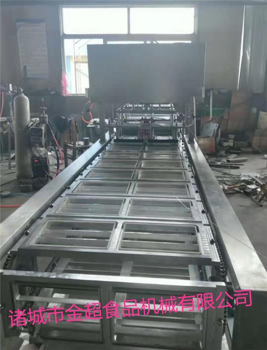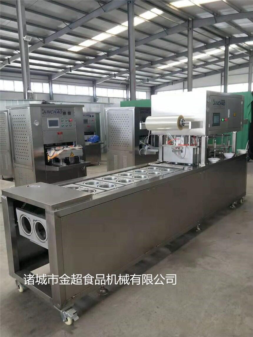 全自动连续封碗包装机是在普通真空包装机的基础上发展起来的新一代真空包装设备。它能将拉伸片膜通过该设备加工成形状后用复合片膜附在上面,抽真空后封口,最后分割成独立的产品的一种设备。适用于对各种食品,肉制品、海产品、果蔬、酱菜、冷却肉、五金元件等进行真空、封口包装。先将产品放在盒/碗里,再将盒/碗放在设备的放料区,盒/碗随着链条的向前运行进入到封口模具里,模具上升,在封口模具里将上膜附在盒/碗上,先抽真空(可根据用户产品包装要求,在抽真空的基础上,充氮气或混合气体进行包装)封口(上膜和盒/碗封在一起)冲切,最后排气,降模,包装好的产品随着链条继续向前运行,从出料口出料。设备还附加了光电跟踪对齐彩膜系统,为用户节约成本,提高工作效率,提高包装档次,还可以根据用户产品包装要求,配备自动打码系统。