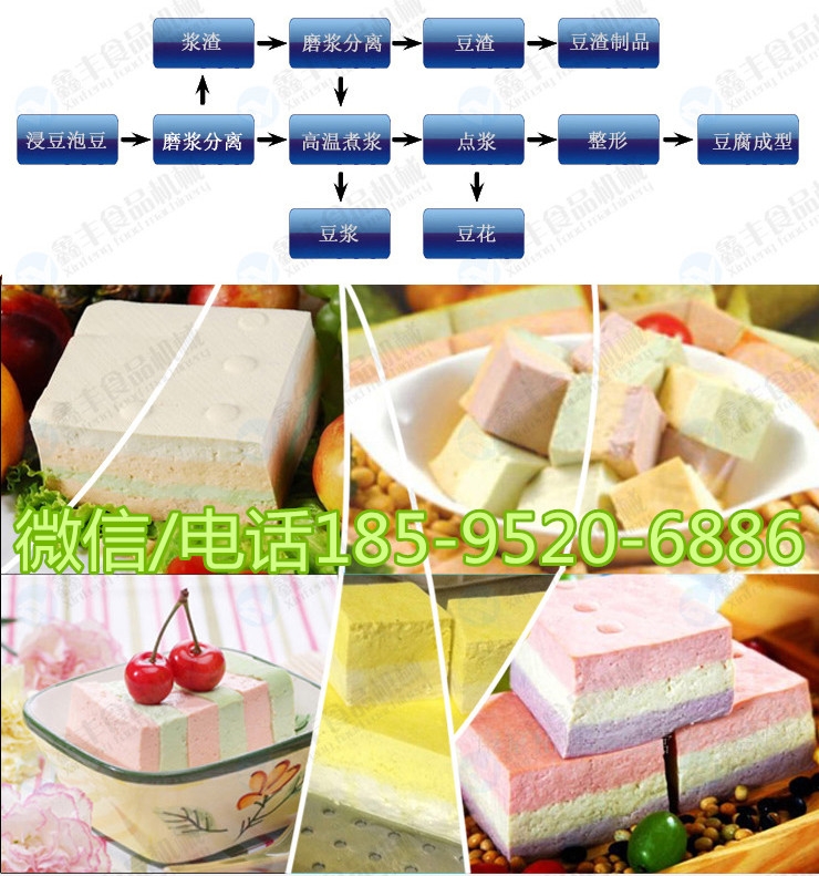 1、一机多用:可同时生产各式果蔬彩色豆腐、果蔬豆浆、营养豆花、美味豆奶等多种豆制品,还可以与其他设备和工艺配套生产更多豆制品。