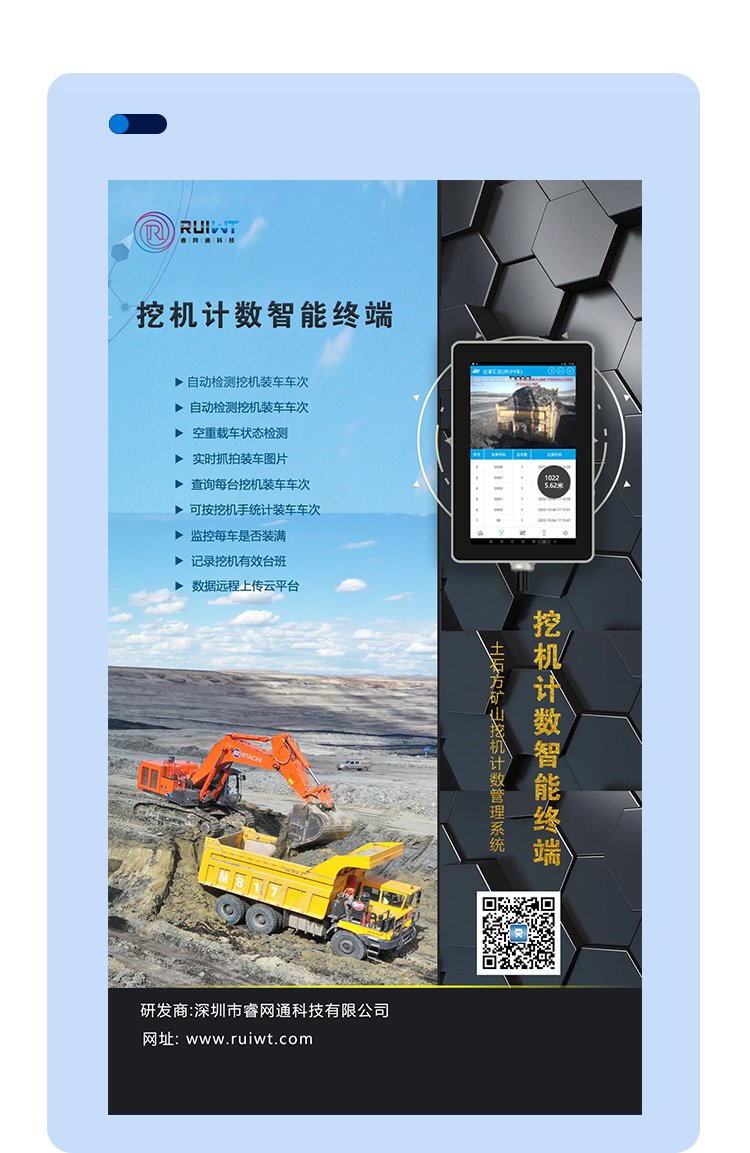 ????睿网物联挖机智能计数终端采用云计算结合物联网技术进行信息采集和数据分析,通过照片留证的方式降低人为误差的影响,数据自动采集,大大降低了外部因素对数据客观准确性的干扰,也降低了数据采集和统计的工作量。同时前端设备信息实时同步也让挖机作业情况随时随地可查,从而解决挖机管理中存在的各种问题。