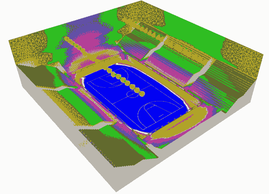 举例:场馆长度50米,宽度48米,带观众席,采用马道安装方式,净空高度15米,照度设计为专业比赛,非电视转播要求,采用FS-QC0869-300W LED球场灯