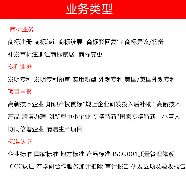 服务内容 | 专利申请 专利转让 商标注册 | ||
