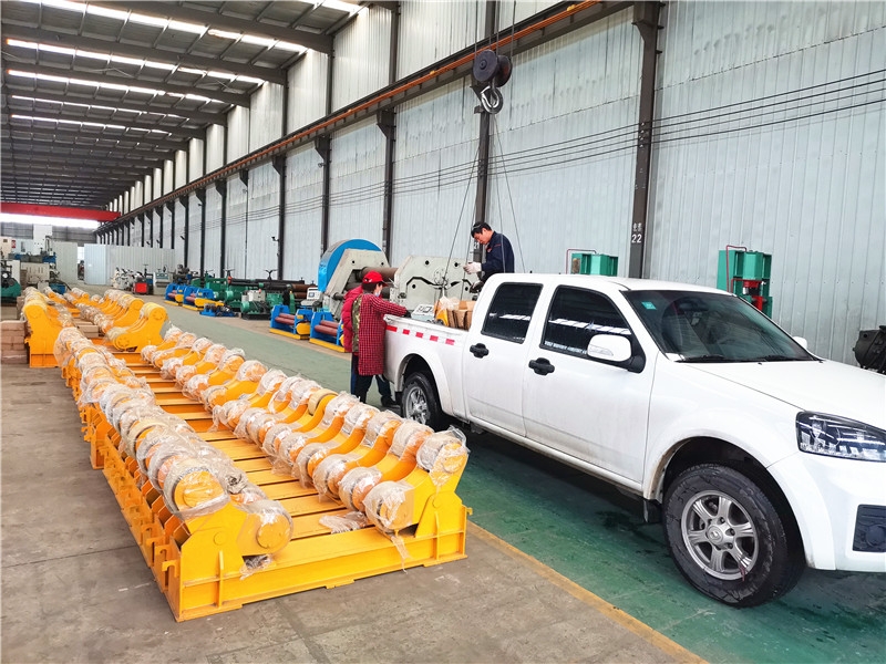 自调式滚轮架可用于管道、容器、锅炉、油罐等重型圆筒形工件的装配与焊接,操作机、埋弧焊机配套,可以实现工件的内、外纵缝或内外环缝焊接;若对主、从动滚轮组的高度作适当的调整后也可进行锥体、分段不等径回转体的装配与焊接。对于一些非圆形焊件,若将其装卡在制定的环形卡箍内,也可在该滚轮架上进行焊装作业。