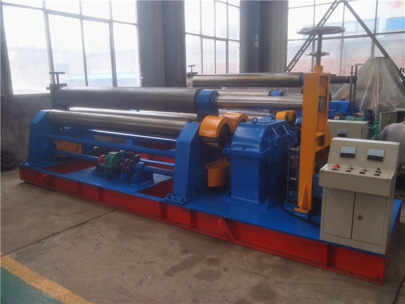 该机为对称式三辊卷板机,两下辊为主动固定辊,上辊通过升降丝杆、涡轮、蜗杆在两下辊中间对称作上下移动,两下辊的左、右旋转和上辊的升降移动均靠电机带动减速器来完成,并能借助手动离合器把上辊调节成平行或倾斜位置,以适应卷制圆形和锥形工件的需要,涡轮上下配有特种压力轴承,转动轻松、省电耐用。该机集机身、传动、电器部分为一整体,其结构紧凑、操作方便、便于搬运、安装和维护。