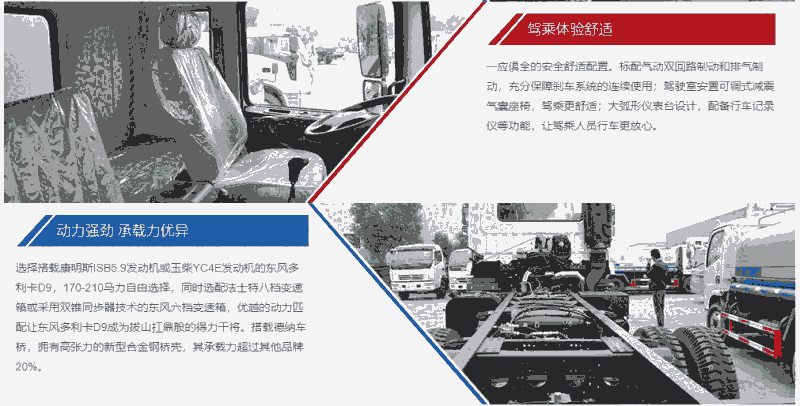 国六底盘配置:采用东风多利卡D9国六排放,康明斯210马力,295/80真空胎,3950轴距,东风6档,原厂空调,ABS,电动玻璃,中控锁。