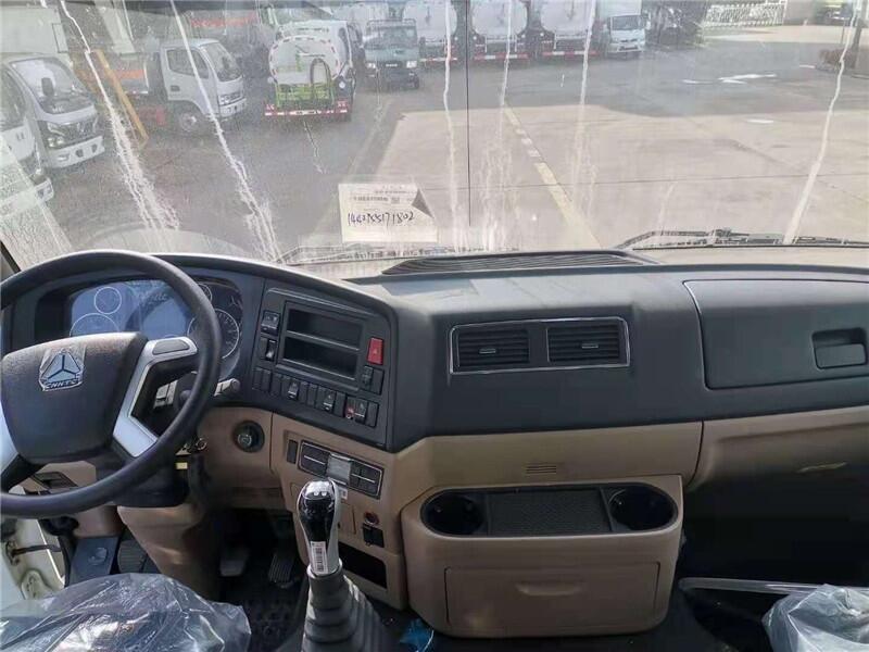 国五底盘配置:采用东风多利卡国五排放底盘,单排白色可前翻驾驶室,轴距3800mm,朝柴156马力发动机,5档变速器,2.7吨前桥5吨后桥,原厂8.25R20钢丝轮胎,断气刹,动力转向,带ABS。