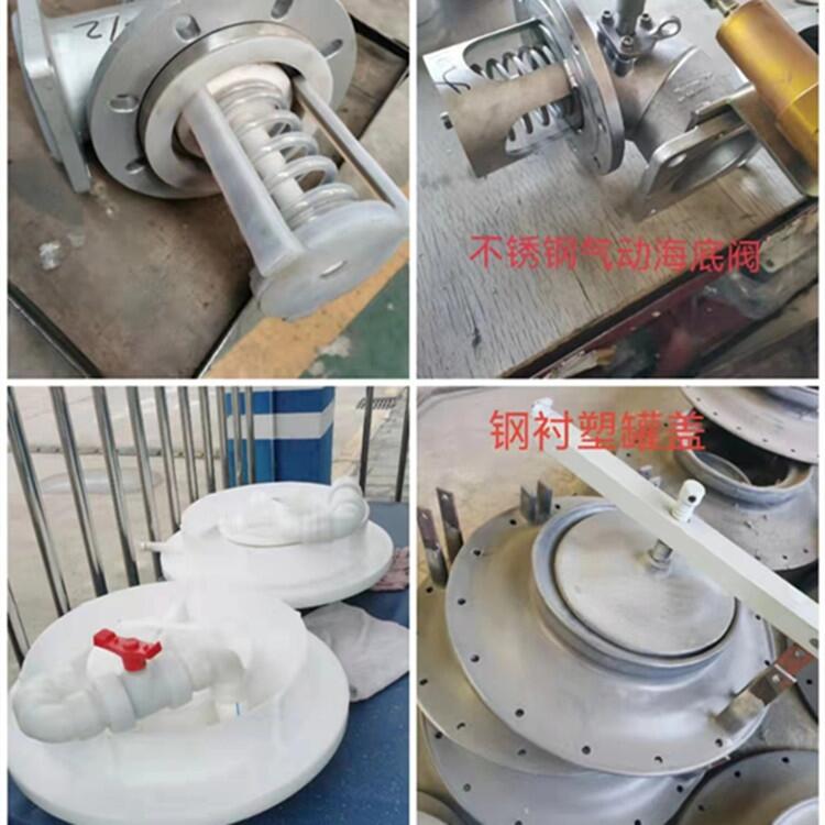 顶两个全塑或钢衬塑进料口,两个通气阀,一个DN100不锈钢衬四氟海底阀带紧急阶切断开关,