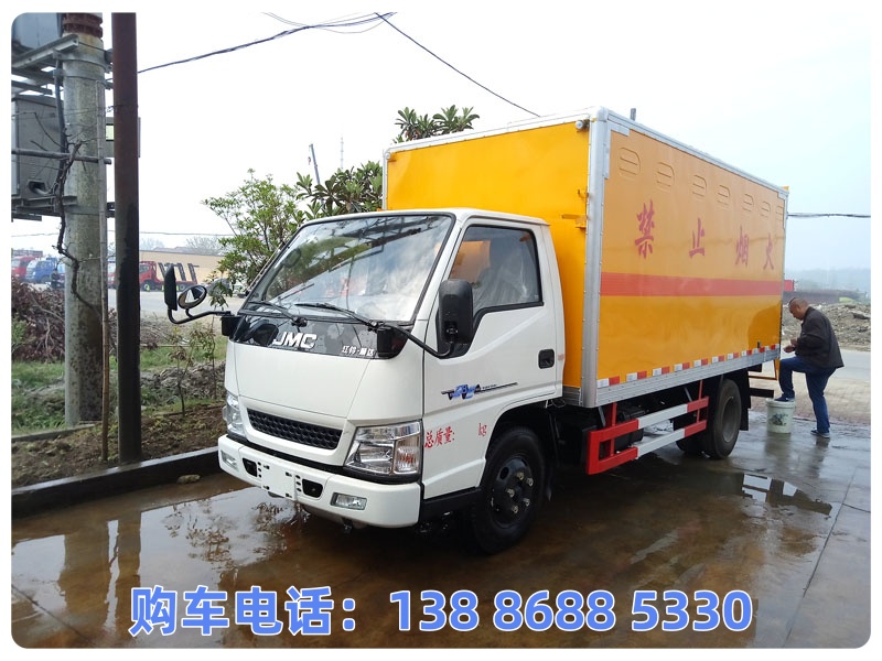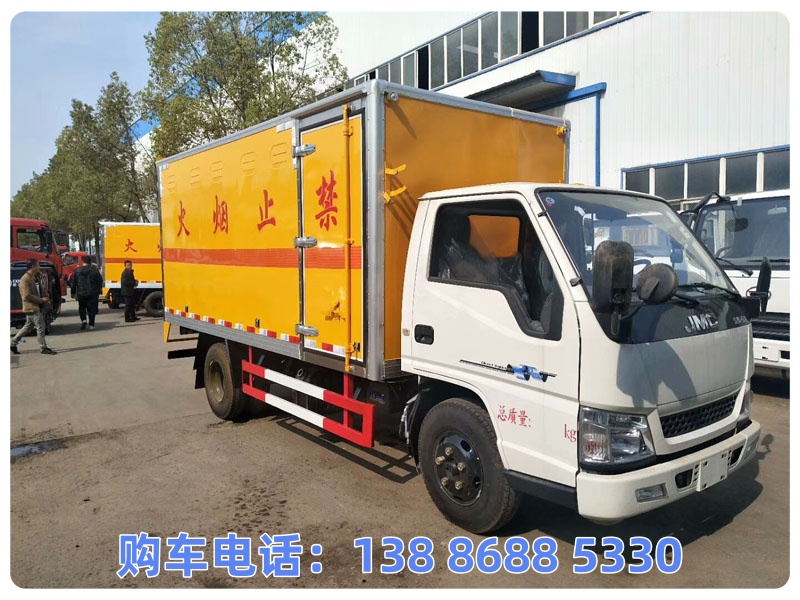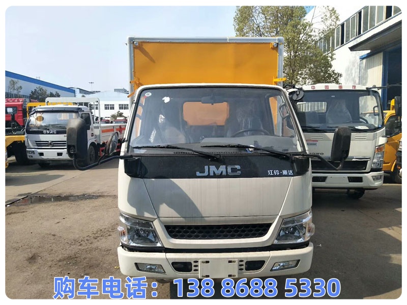 该车为危险货物运输车辆,运输介质具有独立容器(瓶)包装.类项号:6.2.此车顶部不可开启.侧面防护材料:Q235A碳钢,连接方式:左右侧面防护采用螺栓连接.后防护装置材料:Q235A碳钢.连接方式:采用焊接连接.后部防护断面尺寸(mm):100×50,后部防护离地高度(mm):370.选装液压尾板,选装时后防护装置与尾板采用焊接连接。材料:Q235A。后防护截面尺寸:直径100mm,离地高度为360mm;尾板收起状态水平长度为280mm,尾板质量为350kg.该车前轮安装盘式制动器,前置排气管,装配限速装置,限速80km/h,采用子午线轮胎.安装带有卫星定位功能的行驶记录仪.ABS系统型号:APG3550500A,ABS系统生产厂家:浙江亚太机电股份有限公司.仅采用发动机/油耗申报值(L/100km)对应关系为:JX493ZLQ6D/10.75.转向轮装备轮胎爆胎应急防护装置.选装厢体不开侧门,选装其他厂家同等功率不同型号的制冷机组,随底盘选装驾驶室.该车可选装直接供电方式的ETC车载装置.随底盘选装后部灯具样式.选装ABS系统型号:3550B500,ABS系统生产厂家:浙江亚太机电股份有限公司;选装ABS系统型号:VIE ABS-II,ABS系统生产厂家:浙江万安科技股份有限公司.选装内部专用装置以及左侧箱前百叶窗,整备质量对应的配件配备情况:润滑剂,燃油,备用车轮,制冷机组.货厢重量1050kg(不含侧防后防重量,货箱重量误差不超3%),厢体材料为外玻璃钢,内不锈钢,中间保温板.底板厚80mm,边板厚80mm.选装不同侧门外观.