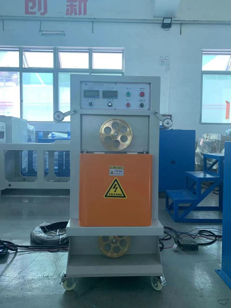 设备组成:1.放线(主动,被动,甩筒,无轴式等);2.整直或张力架;3.预热器(可选);4.过粉机(可选);5.主机;6.辅机(可选);7.水槽;8.印字机或喷码机(可选);9.测径仪;10.牵引(皮带,轮式);11.储线架;12.计米装置;13.火花机;14.收线(双盘,摇盘加包膜、无轴式);15.主控箱