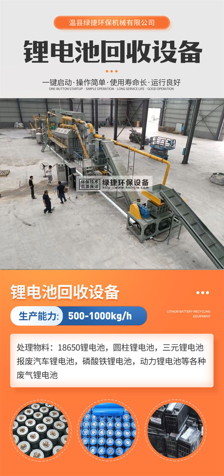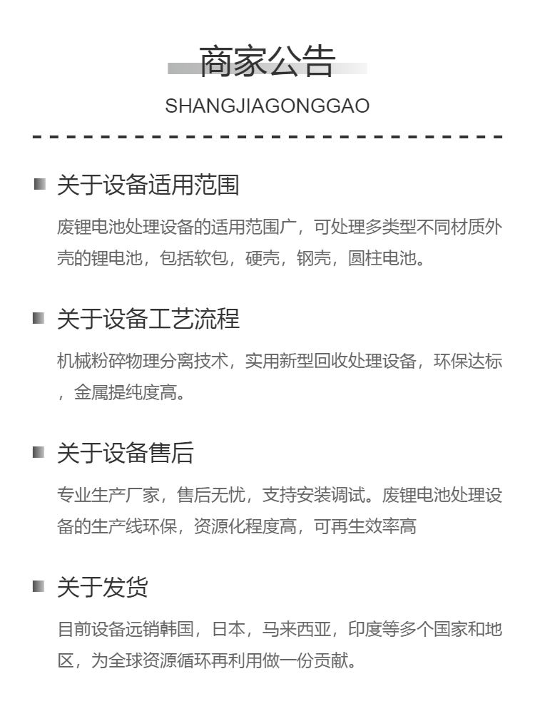 产品特点 | 适用范围广,可处理多类型不同材质外壳的锂电池 | ||