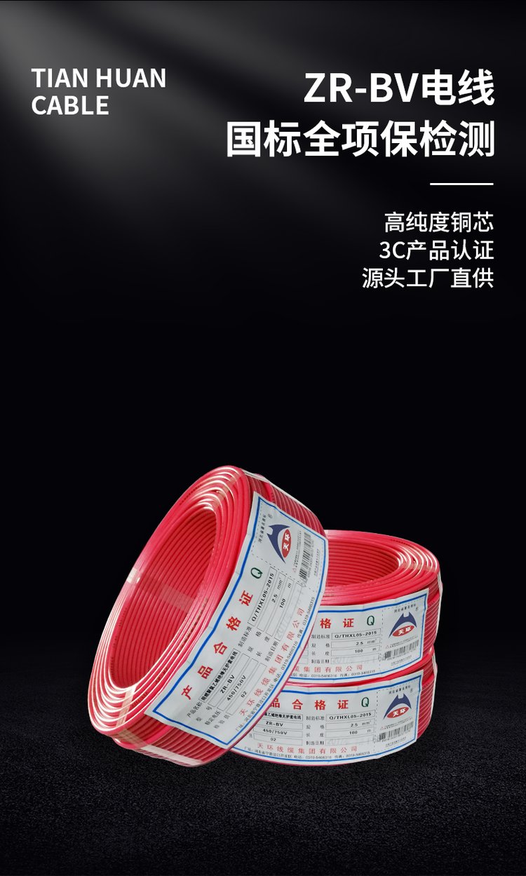 天环线缆 国标阻燃 家用工程装修 单股铜芯硬电线 ZR-BV-1.5/2.5/4/6 品牌 | 天环 | ||