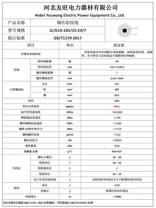 四、架空钢芯铝绞线JL/G1A185/25厂家价格产品基本参数及样本图片: