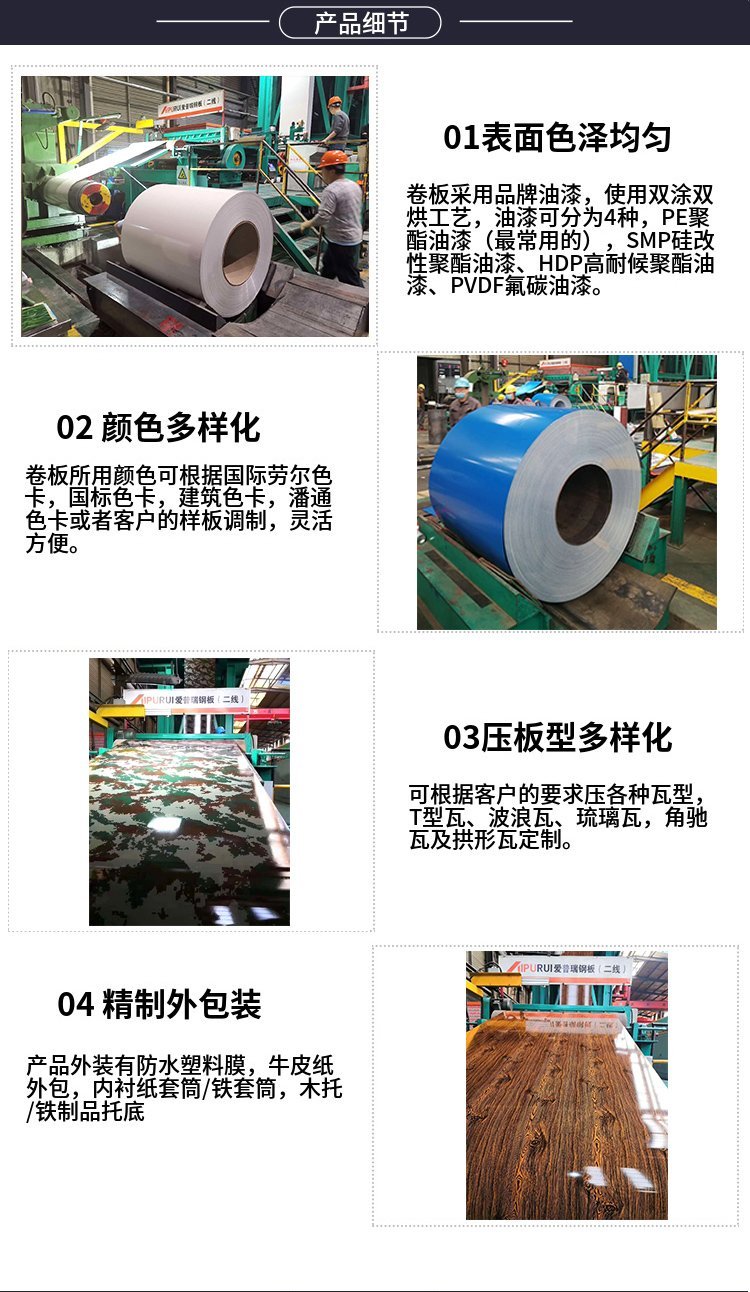 山东爱普瑞钢板有限公司主要从事钢产品、地产、农产品的进出口业务,年销售各类钢材100万吨,生产厚度从0.12MM-2.0MM,在钢材流通领域拥有较高知名度,并且公司产品还出口到欧美东南亚、非洲等国家。爱普瑞公司彩涂生产线采用德国“西门子”自动化控制系统,引进美国法塔生产工艺和技术,设备水准达到国内先进水平,生产原料全部进口,以保证高品质产品。相比一般只有40米的烘箱其生产车间配备60米长的烘箱,延长了固化时间,使产品达到高耐候、自清洁、抗老化、抗褪色的特点。涂漆房采用了七个涂机,而普通生产厂只有四个,真正意义上实现了双涂双烘,结束了江北区域不能做双面彩涂的历史。设备一机多用,可以生产彩涂板、印花板、迷彩板、珠光板、彩铝板、网纹板(皱纹板)等。