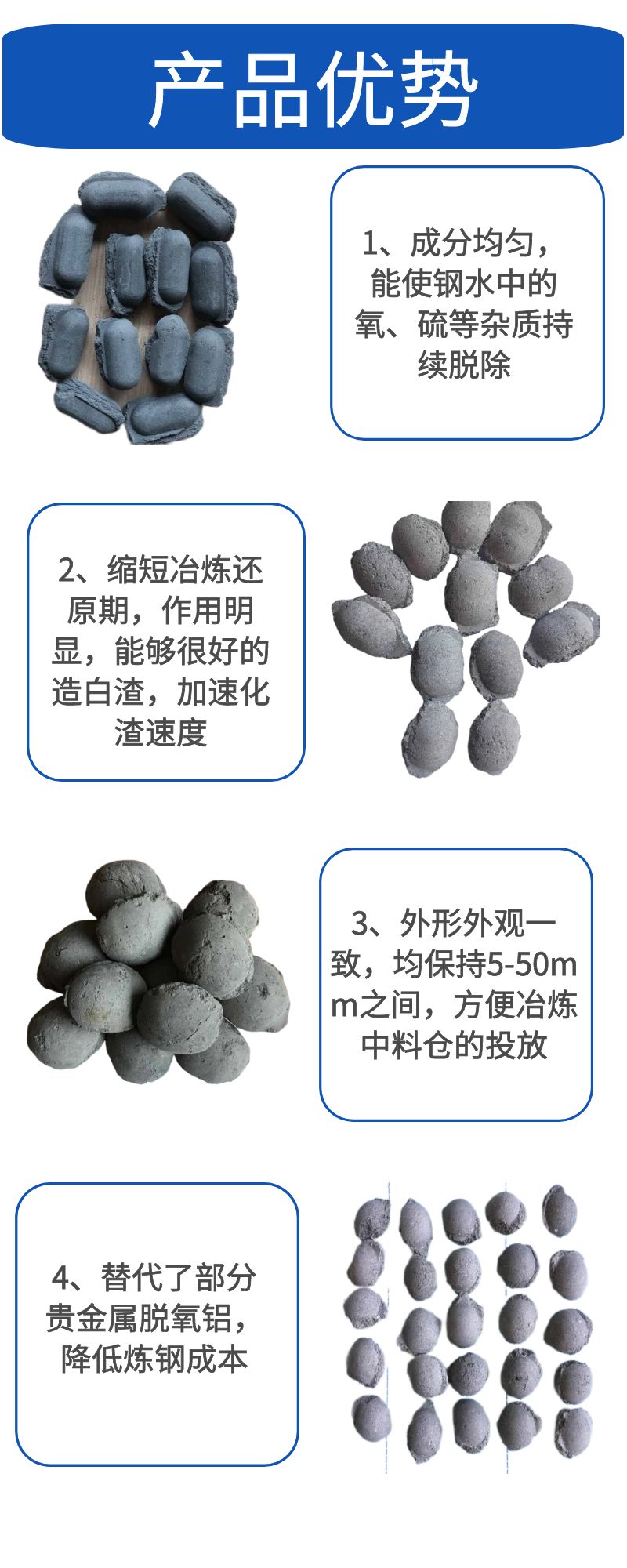 作用 | 精炼造白渣 钢水脱氧 | ||