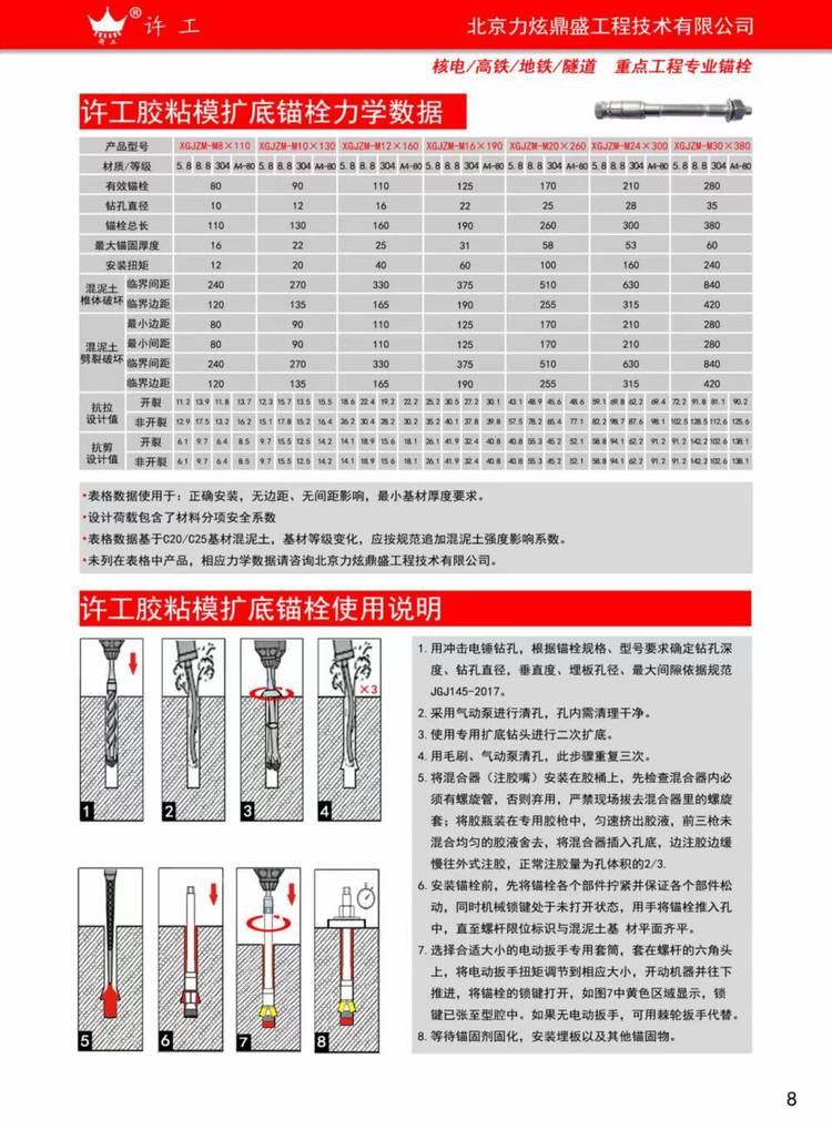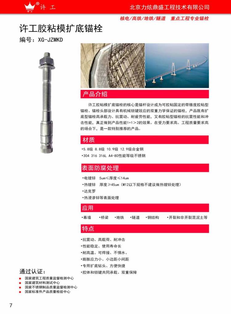 许工胶粘模扩底锚栓的核心是锚杆设计成为可胶粘固定的带锥度胶粘型锚栓、锚栓头部设计具有机械锁键效应的双重力学保证的锚栓,产品既有扩底型锚栓高承载力、抗震动、耐疲劳性能,又有胶粘型锚栓的抗震性能和冲击性能,真正做到产品性能1 1>2的效果。在受力要求高、工程质量要求高的场合下,是一款特别推荐的产品。