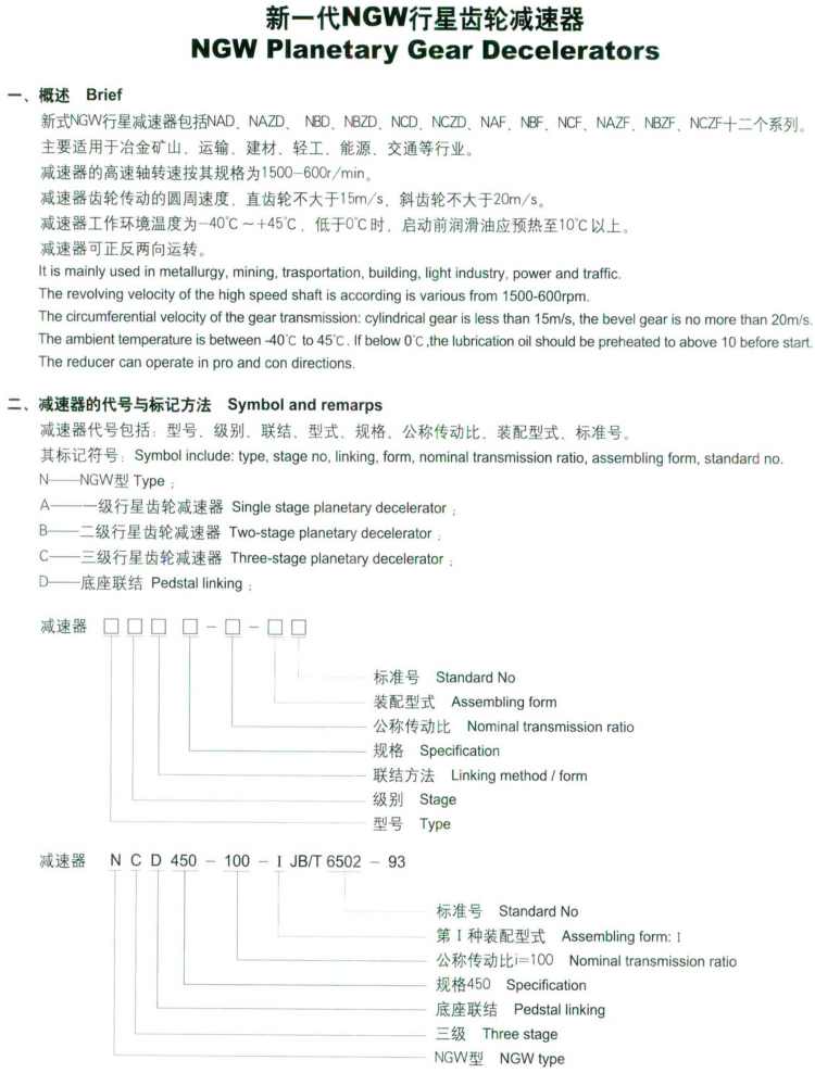 NBD630行星减速机主要构建有太阳轮、行星轮、内齿圈、行 星架。 为了使三个行星轮的载荷均匀分配,采用了齿式浮动机构, 即太阳轮或行星架浮动,或者太阳轮、行星架两者同时浮动。减 速机中的齿轮为直齿渐开线圆柱齿轮。具有一下特点: