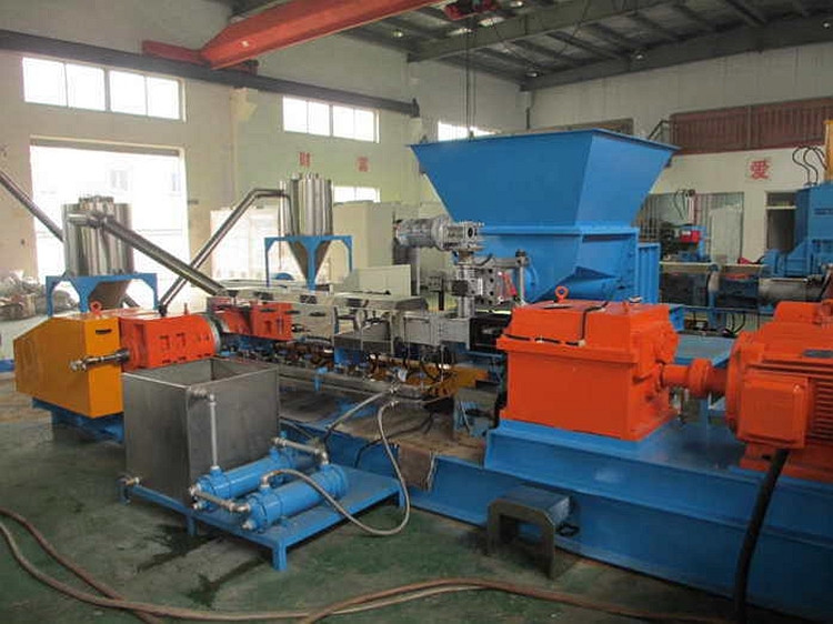 pVc电缆料造粒机介绍 1、 将pVc物料投入高混机混炼后,经螺旋上料机将粉状物料投入gls-上阶平行双螺杆挤出机 2、 gld-上阶平行双螺杆挤出机将物料混合均匀,温度为140-160℃的状态下完成塑化混炼、充分分散均匀。然后挤出的混合物料成为熔融体(温度在130-140℃),直接落入大口径gld-下阶单螺杆挤出机。 3、 gld-下阶单螺杆挤出机将120℃的熔体,在低转速、高压和冷却状态下完成挤出造粒。挤出时温度已降至120-140℃。这时才能完成风冷模面热切粒,而且保证在切粒过程中不粘粒。 4、 风冷模面热切切下的粒子,经过二级风冷旋风分离器的冷却,粒子温度降至35-40℃,再经过风冷加长振动筛,将粒子温度降至室温以便送入成品料仓进行包装;pVc电缆料造粒机;高混机——螺旋自动上料机——双螺杆造粒机——单螺杆造粒机——对吹热切机头——级旋风分离器——二级旋风分离器——加长风冷振动筛——成品料仓;配方不对做出pVc电缆料表面粗糙分两种,一种是疙瘩,一种是麻点。疙瘩主要是由一些混合时分散不均匀的粉料聚集体,挤出过程中不能塑化,被塑化的pVc物料包覆一起由口模挤出,而在电缆料中形成的。前面提到的鱼眼和未充分吸收增塑剂的pVc树脂颗粒,也会造成疙瘩现象,但一般比较小。如今配方,追求填料更细更多,填料如果表面处理不好,混合时效果不佳,出现团聚现象的几率会比较大,只不过团聚程度的大小以及电缆料中表现是否严重,是否成为了问题。麻点问题相对要复杂一些,一般认为和物料中跑出的小分子物质有关。这些小分子物质来源于树脂本身、增塑剂、润滑剂。由于挤出造粒生产电缆料时,都需要抽真空,按道理这些小分子物质应该被抽提走,但为什么还会出现呢?通过分析发现,其实这些小分子物质更多是抽真空后,物料中产生出来的,很多是来自量不是很大的润滑剂,当然也有增塑剂中的。因为电缆料作为软制品,有大量的增塑剂,所以配方设计时一般不太注意润滑剂,会使用一些低档滑剂,这些低档滑剂熔点低,挤出后期很多成分易挥发出来,此时已无法排除,只好被熔融物料夹裹着前行,由于气体比重轻,会尽可能逃逸到表面,占据一定空间,和物料一起被强制输送,从模口出来后它立即进入空气中,但在电缆料上却留下了点点痕迹。有一种情况是,配方外润滑严重不够,特别是后期润滑不够,熔融物料在挤出过程中与机械表面产生粘连现象,造成表面粗糙,会有出现一些坑洼。发生这种情况时,一般电缆料表面的整体都不会太好。欢迎咨询: pVc电缆料配方 双螺杆造粒机 电缆料造粒机
