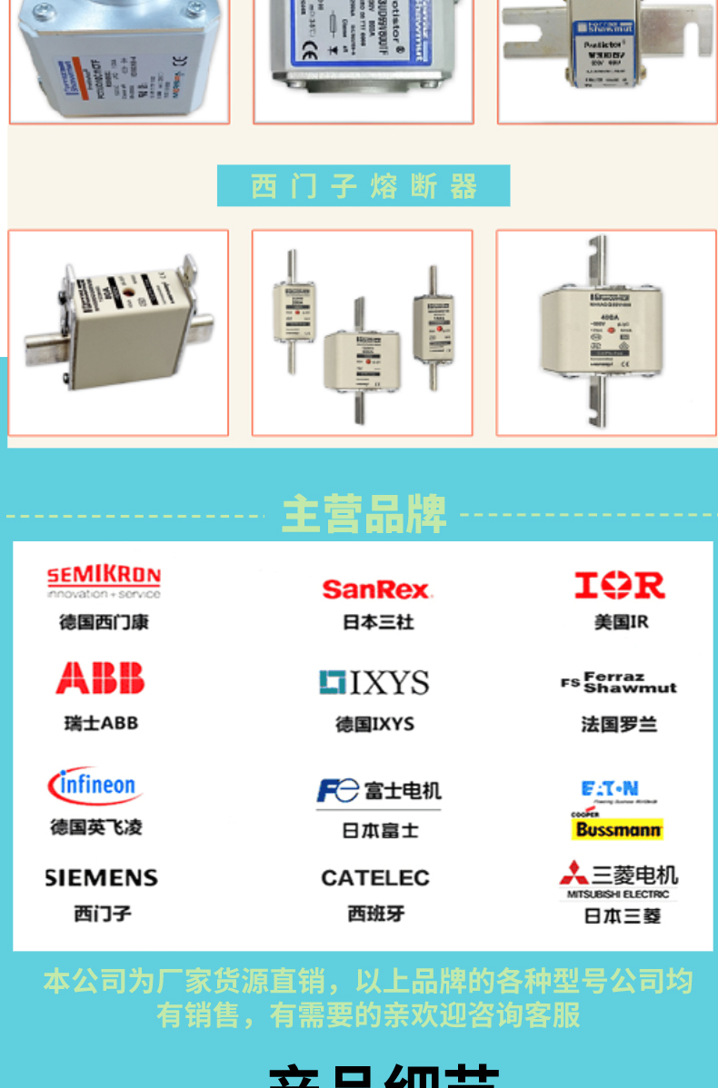 公司主营原装进口电子元器件:Infineon/英飞凌,Semikron/西门康,IXYS/艾赛斯,SANREX/三社,FUJI/富士,Mitsubishi /三菱,Westcode/西玛,美国IR 、Microsemi/美高森美快恢复二极管、整流桥,IGBT模块、可控硅晶闸管;Siemens/西门子,Bussmann/巴斯曼,Ferraz/罗兰 、Hinode/日之出、茗熔等厂家熔断器,本公司商品均为正品,实物实拍,优势现货,大量库存~品种齐全、价格优惠、欢迎咨询!!