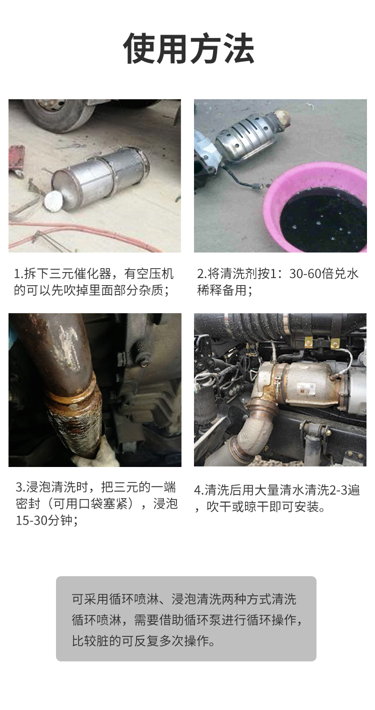 循环喷淋,需要借助循环泵进行循环操作;浸泡清洗时,把三元的一端密封(可用口袋或者薄塞紧),浸泡15-30分钟,看下效果,比较脏的可反复多次操作;