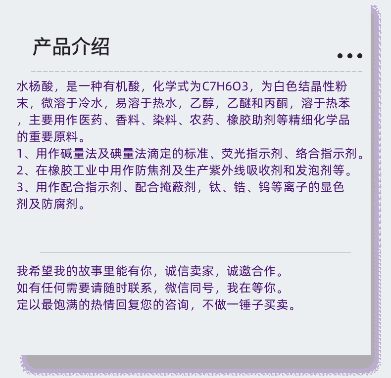 能为您提供一次满意的采购体验,是我们全体员工矢志不渝的奋斗目标,在竞争如此激烈的市场环境中,只有做到不忘初心,艰苦奋斗,把客户利益放在心里才能生存下来,我司已经在化工行业摸爬滚打十余年,靠的就是坚决秉承公司信誉至上的经营理念,日积月累,才沉淀了如此之多的优质客户。十年来,我们与客户同吃苦,共进退,一起抵御市场经济的严峻考验,同时也与客户们建立了不可动摇的互相信任的根基和感情,因为我司全体员工知道,无论何时,我们和客户都是一个不可分割的整体,为客户着想就是为自己的发展着想。路漫漫兮修远兮,吾将上下而求索。这就是我公司对所有新老客户的庄严承诺。