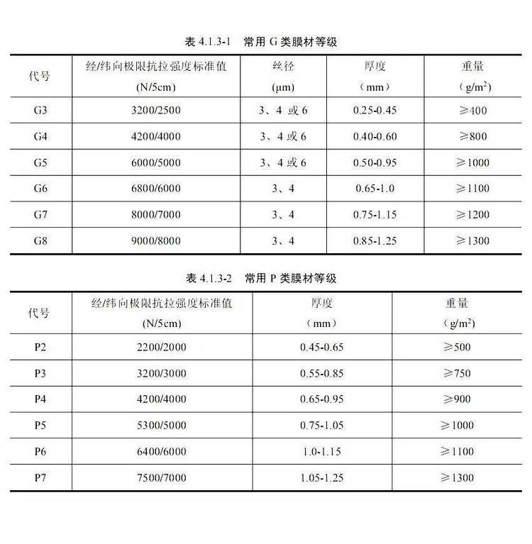 《膜结构技术规程》CECS158 依据膜材的极限抗拉强度值,将膜材分了几个等级,便于应用。膜材强度的单位为N/5cm(这与膜材强度的测试方法有关)。确定膜材强度等级时,依据的是极限抗拉强度值,而膜材厚度和重量仅是一个参考。