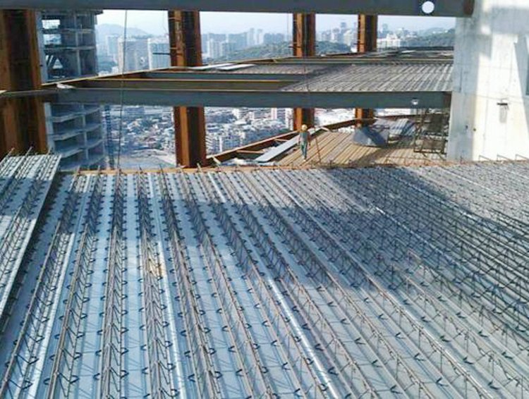 在施工现场,可将钢筋桁架楼承板直接铺设在钢梁上,然后进行简单的钢筋工程及其它相应的工作,便可浇筑混凝土,适用于复杂多变的建筑施工。底部镀锌压型钢板仅做模板用,不替代受力钢筋,故不需考虑防火喷涂及防腐维护的问题,并且钢筋排列均匀,上下两层钢筋间距及混凝土保护层厚度能充分得到保证,为提高楼板施工质量创造了有利条件。浇筑混凝土形成楼板后,具有现浇板整体刚度大、抗震性能好、抗冲击性能好、防水性能好等优点。