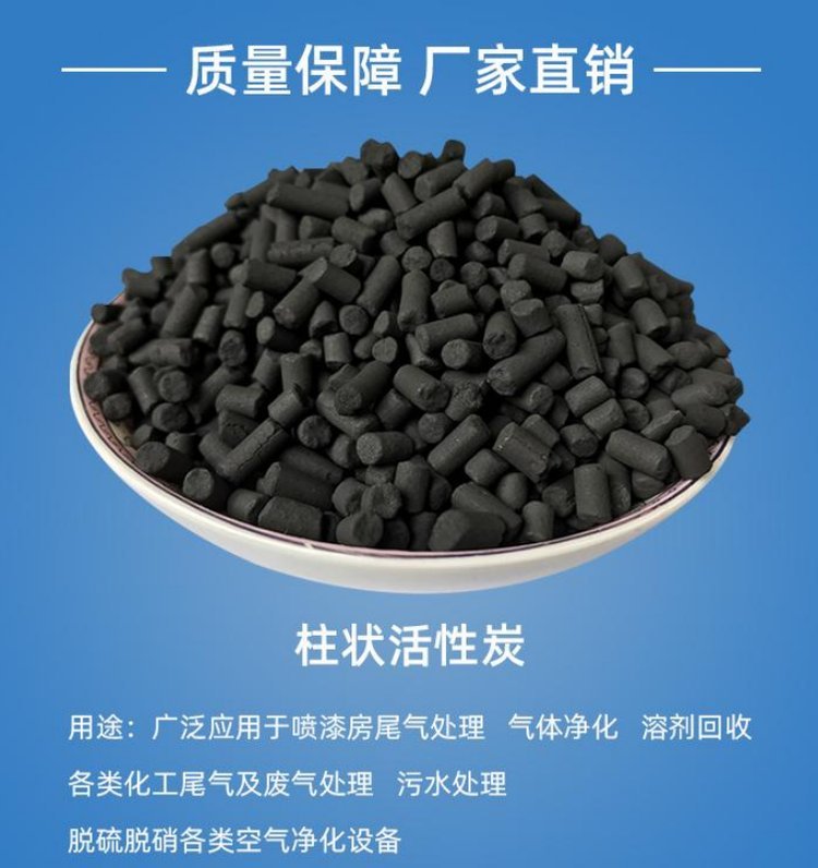煤质黑色圆柱状活性炭,不定形煤质颗粒活性炭,又称破碎炭。圆柱形活性炭又称柱状活性炭炭,一般由粉状原料和粘结剂经混捏、挤压成型再经炭化、活化等工序制成。也可以用粉状活性炭加粘结剂挤压成型。具有发达的孔隙结构,良好的吸附性能,机械强度高,易反复再生,造价低等特点;用于有毒气体的净化,废气处理,工业和生活用水的净化处理,溶剂回收等方面。