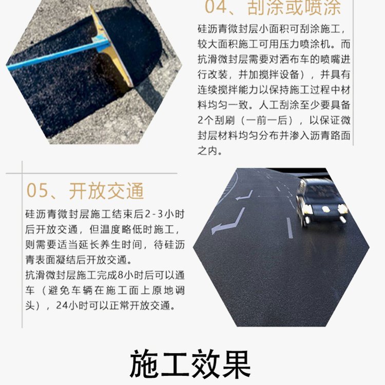该产品为高科技硅沥青路面预防性养护材料,分为油性加强型及水性普通型,与各类路面附着力强,并富含活性油分,可向老化沥青路面细微裂缝及空隙中补充沥青缺失的活性油分及骨料,恢复路面结构的韧性和弹性,提高路面整体强度,提供持久的密封性能。