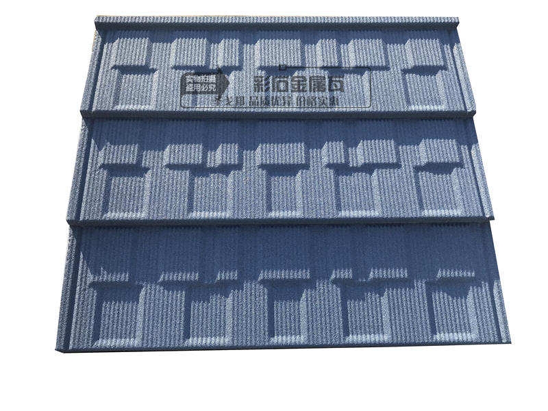彩石金属瓦铺对于屋面与垂直墙的交接部位,应当将墙侧的瓦片折弯,泛水收边覆盖其上.从离垂直墙面最近的一片完整瓦到垂直墙面的距离,来确定折弯线。加上40mm为切割线。切割并折弯瓦片。彩石金属瓦铺脊瓦的安装时,应顺着最大频率风向搭接,并应充分搭盖住两坡面彩石金属瓦。