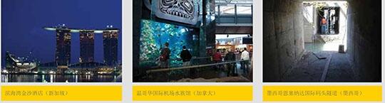 上海明珠地铁线、北京地铁复八线、上海金融中心大厅及外墙、四川大桥水库、天津国贸二期、大连星海湾广场、北京机电设备局大楼、南京交通大厦、北京水立方、马来西亚地铁、亚特兰帝斯酒店、澳门葡京、韩国首尔大桥、波音装配大厅。