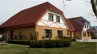 3)罗马型彩石金属瓦色泽鲜艳,丰富多彩,更美观时尚,多种颜色可供选择,是一种常见的屋面瓦瓦型。