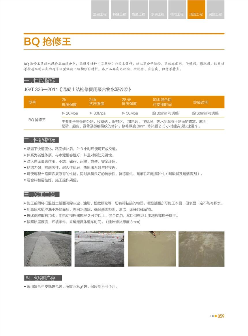 1、BQ砼路面薄层修补专用抢修王,主要用于高低速公路、收费站 、服务区、 加油站 、飞机场、等水泥混凝土路面的蜂窝、麻面、起砂、起皮、露骨及微细裂纹的修补。修补厚度3mm,修补后2-3小时能实现快速通车。