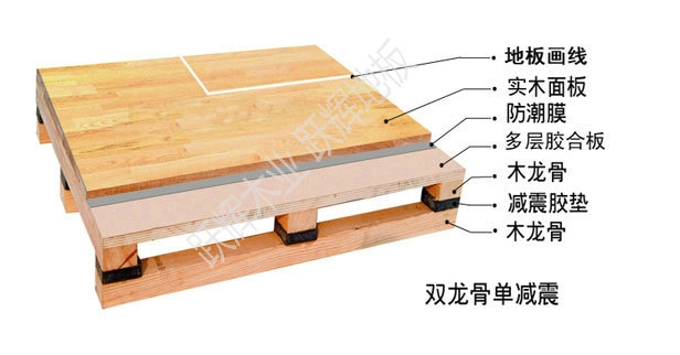(2)双层结构体育木地板:主要由面层地板、毛层地板、龙骨层、防潮层和弹性胶垫层等材料组成的复合结构形式。