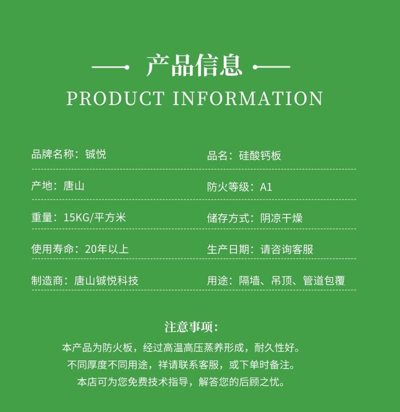 硅酸钙板都能达到如上效果。硅酸钙板的颜色由于材质的原因通常为土黄色或木色,常规规格一般是长2.44米、宽1.22米,厚度根据用途不同通常有5mm、6mm、8mm、10mm、12mm、15mm、18mm、20mm、24mm等多种厚度。铖悦建材期待与您的合作。