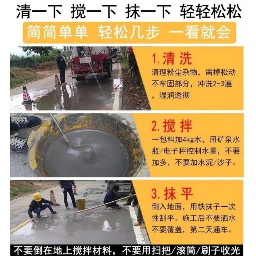 1.1材料采用水泥路面修补料,修补厚度1mm时,每平方米大约需要材料2kg。