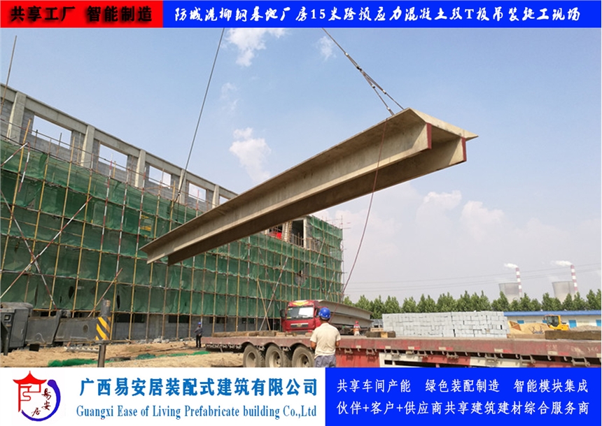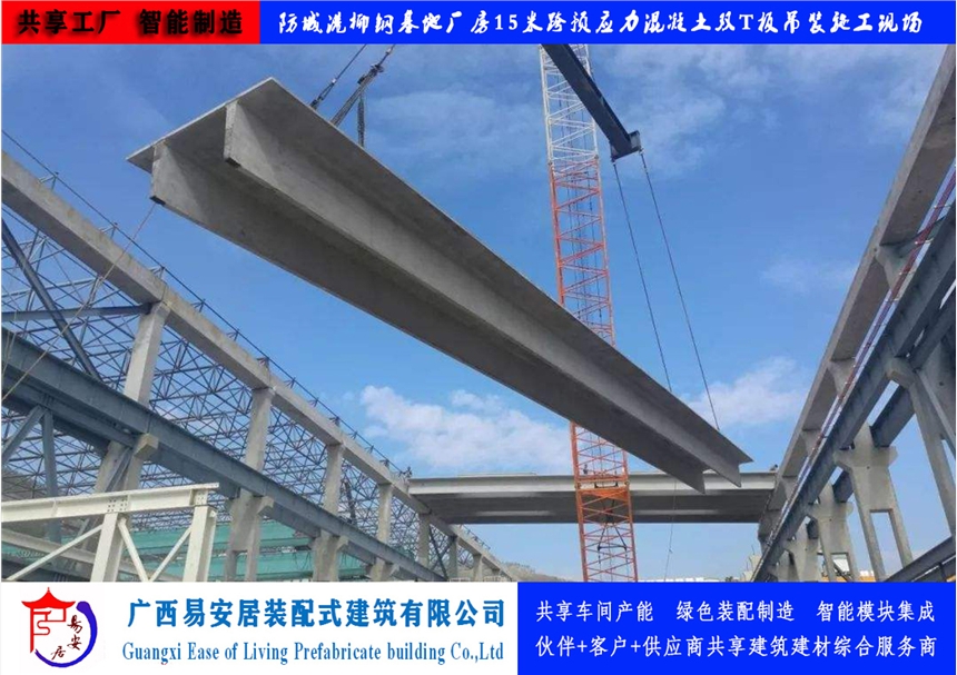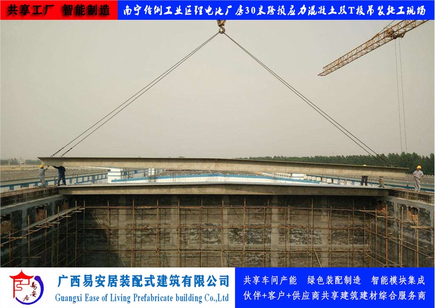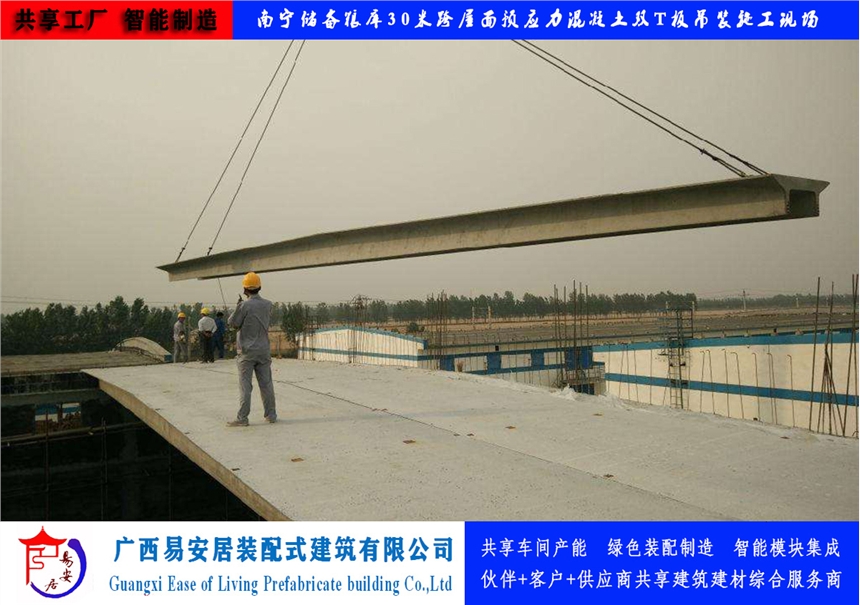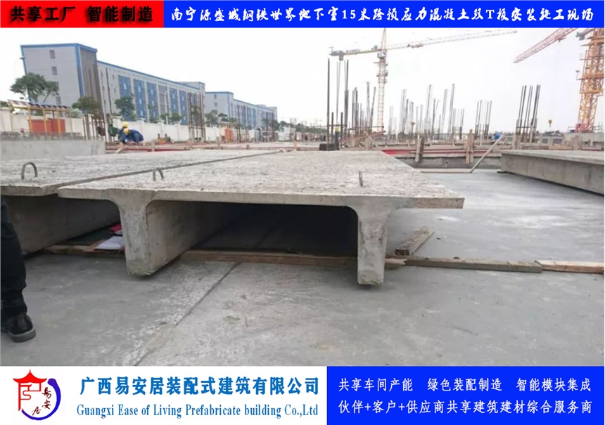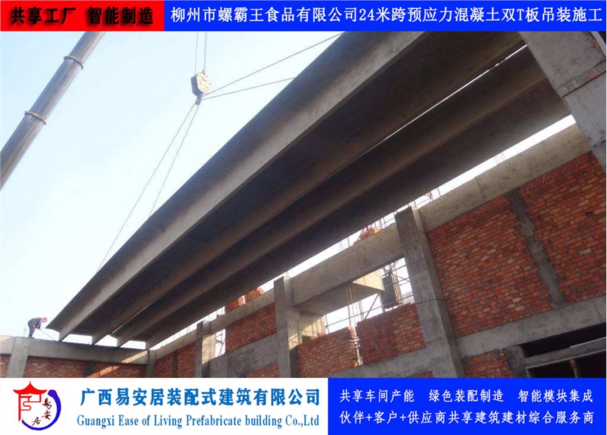广西易安居装配式建筑有限公司有大型预应力混凝土双T板生产设备及生产线和技术检验设备,采用梁板合一式结构,用预应力碳素钢丝和预应力钢绞线做梁的主筋。通过良好的检测手段,确保了产品质量。生产规格尺寸有:以3m为模楼,跨度9-30m,宽度为2m、2.4m、3m的大型预应力混凝土双T板。产品应用于大跨度厂房、仓库等建筑屋面和楼层。具有以下特点:1)跨度大:9-30米跨度,节省梁、板、柱,减少模板、架杆等费用,降低工程造价;缩短工期,加快施工速度。2)结构性能稳定:稳定,防火等级高、抗震性高、保温性能好,抗剪力强,可开天窗;结构找坡,自然防水。3)吊装方便,板面四角有吊环。厂房等建筑搬迁时可重复利用、寿命长达50年。4)工期短,车间、仓库只要把房框砌好,就等于工程完工卖家提供运送及吊装上房服务;屋面坚固,不受大风、暴雪等自然灾害影响;