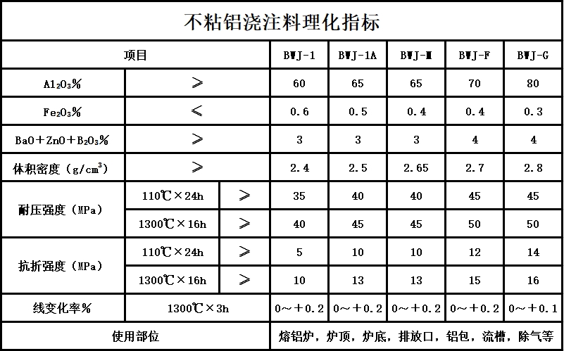 产品用途:不沾铝浇注料是铝加工行业的专用耐火材料,主要用于融铝炉炉墙,炉底,除气箱,流槽和流口,前箱和保温炉等。
