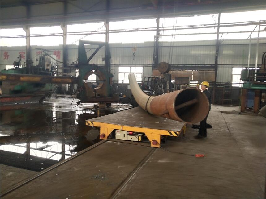 中频弯管的过程是在钢管待弯部分套上感应圈,用机械转臂卡住管头,在感应圈中通入中频电流加热钢管,当钢管温度升高到塑性状态时,在钢管后端用机械推力推进,进行弯制,弯制出的钢管部分迅速用冷却剂冷却, 这样边加热、边推进、边弯制、边冷却, 不断将弯管弯制出来。
